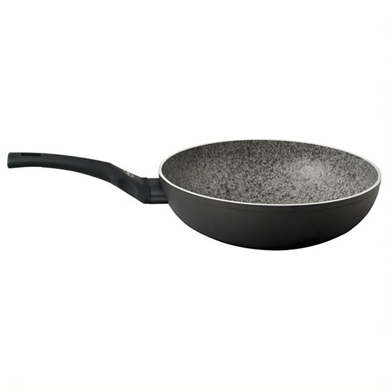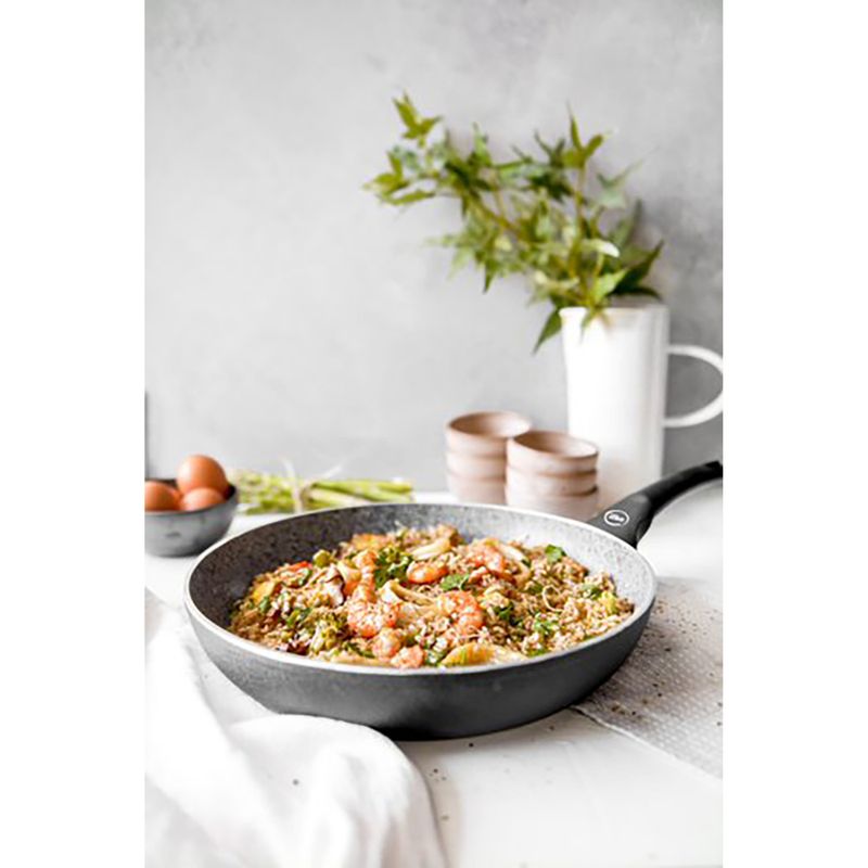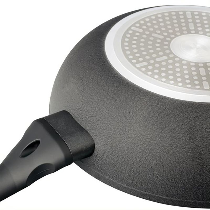La línea de sartenes Black Granite es de aluminio forjado de 3.5mm de espesor con asas y mangos soldados de baquelita soft touch, con recubrimiento antiadherente de granito y placa de inducción incluida, no tendrás problema para usarla en cualquier tipo de cocina. Su diseño elegante con terminaciones de mate e interior de granito le brindarán a tu cocina un estilo sofisticado.
